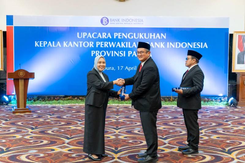 Jayapura,- Anggota Dewan Gubernur Bank Indonesia, Aida S. Budiman mengukuhkan Warsono sebagai Kepala Perwakilan Bank Indonesia Provinsi Papua yang berlangsung di Ballroom Kantor Perwakilan Bank Indonesia (KPwBI) Provinsi Papua, pada Jumat, 17 April 2026.